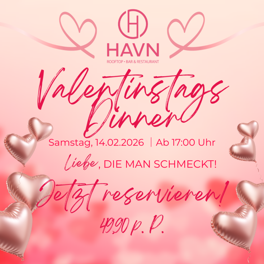 Genießen Sie den Valentinstag im HAVN und lassen Sie sich gemeinsam kulinarisch verwöhnen. Freuen Sie sich auf einen Abend voller Geschmack, Atmosphäre und besonderer Augenblicke. Für diesen Anlass haben wir ein exklusives 4-Gänge-Valentinsmenü für Sie zusammengestellt, begleitet von dezenter, stimmungsvoller Musik, die den Abend untermalt.